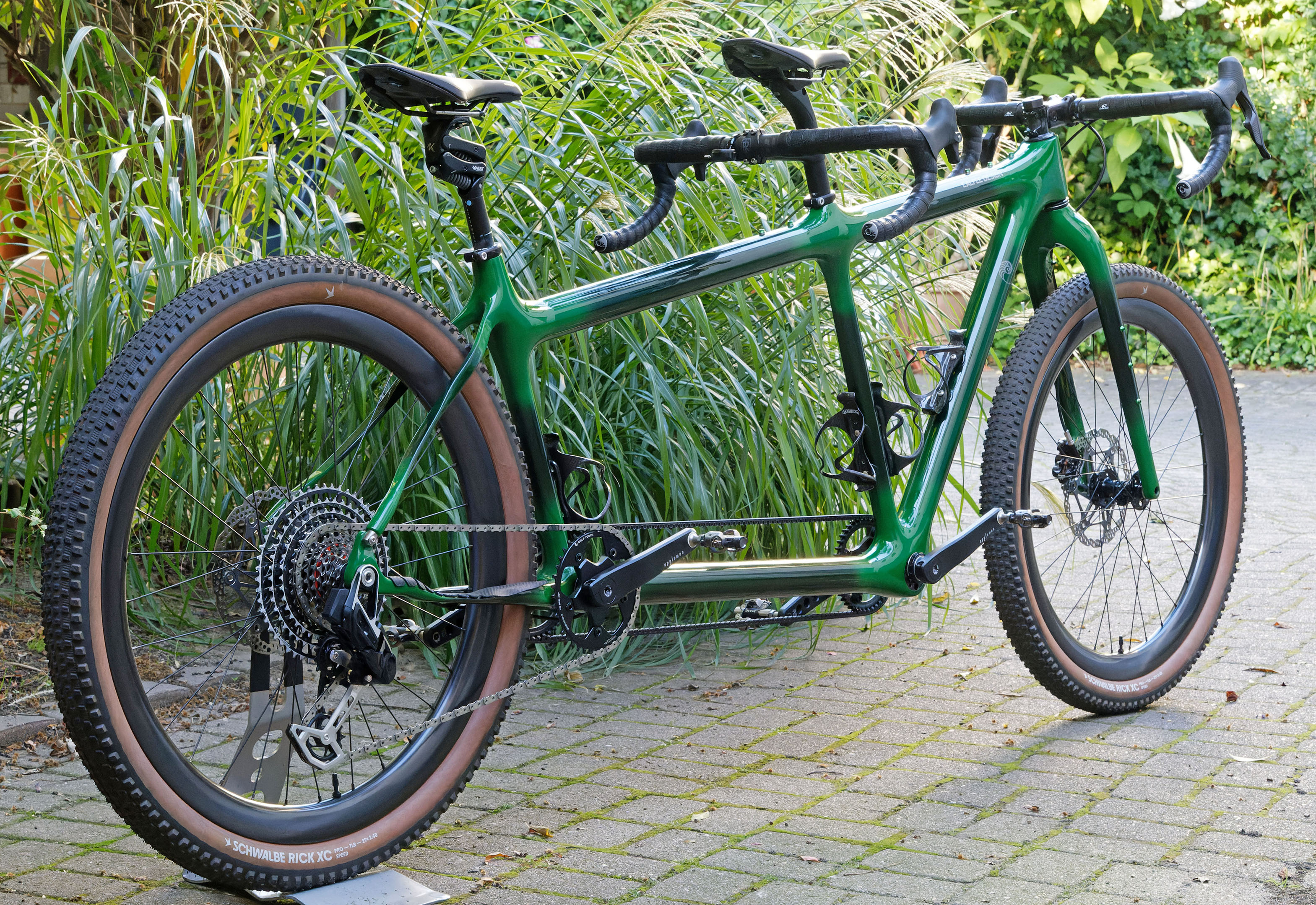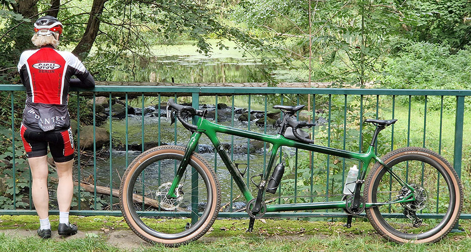 Es entsteht wieder etwas neues – ein Gravel-Tandem, wiederum realisiert von Calfee Design. Nach unseren guten Erfahrungen mit dem Renntandem in 2017 haben wir uns im Dezember 2024 zum zweiten Mal an die Kalifornier gewandt. Unser Wunsch war ein Graveltandem, also mit Geometrie für Rennlenker, das aber für MTB-Reifen bis 65 mm Breite ausgelegt ist, um nicht im Brandenburger Untergrund zu versinken. Man könnte das Wide Gravel nennen oder auch Dropbar-MTB, aber es soll von der Geometrie her kein Kompromiss sein. Und bei alldem bitte aus ästhetischen Gründen falls möglich und sinnvoll ein durchgehendes Oberrohr. Es sollte mit einer Starrgabel und einer Federgabel geliefert werden, die austauschbar sein sollen. Der Rahmen sollte wiederum ein erhöhtes hinteres Tretlager haben. Die Schaltung sollte eine Kombination sein von aktuellen Sram AXS Rennrad-Hebeln und Sram Transmission MTB-Komponenten.