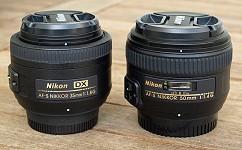 Update 2009: das neue Nikon AF-G 1,8/35, das erste echte Nikon-Normal-Objektiv für die DX-Kameras (entspricht gut 50 mm bei KB). Es ist klein, leicht und preiswert. Als "DX"-Objektiv muss es keine Vollformat-Sensoren beleuchten, daher ist es deutlich kompakter als das dafür verfügbare 1,8/35, nämlich 200 g statt 300 g und ein ca. Drittel des Preises.