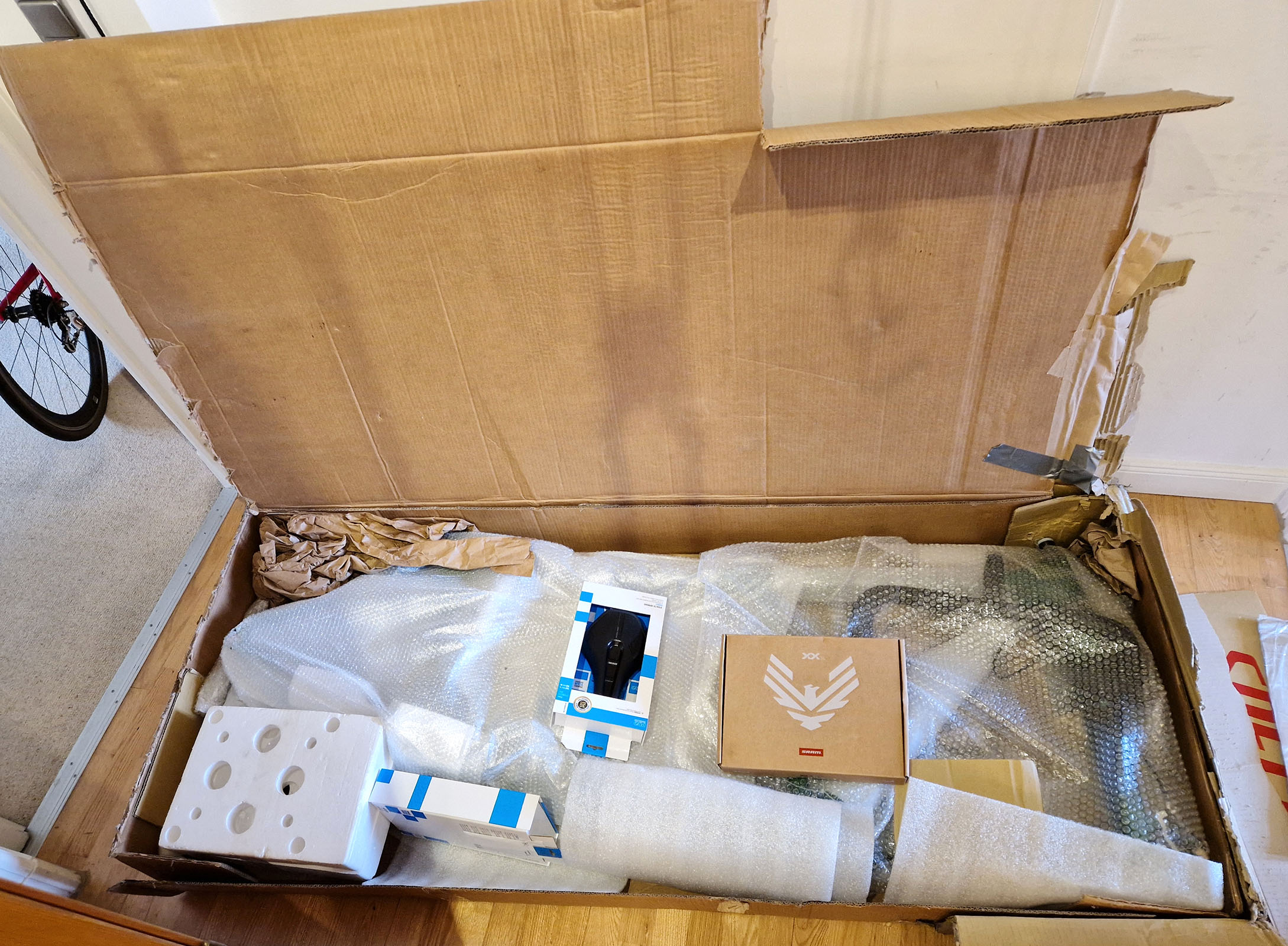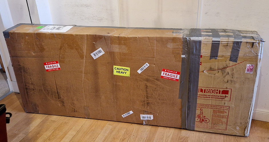 23.8.2025: Das Paket ist da! Auspacken und Aufbauen... Die Verpackung ist nicht sehr ausgereift, ein paar kleinere Transportschäden sind zu beklagen. Ein paar Teile mussten noch (nach)beschafft werden: Bremsscheiben (Hope 200 mm), andere Flaschenhalter (Arundel Mandible).