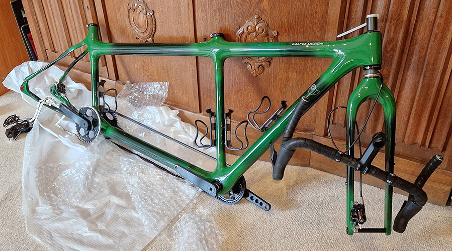 Auch die Lackierung haben wir im Dialog mit Calfee entworfen. Es gab ein gebräuchliches Farbkonzept mit einer Art Türkis, das stellenweise deckend und "translucent" aufgebracht wird. Letzteres heißt, dass die Carbon-Struktur des Rahmens durchscheint, aber im direkt reflektierten Licht die Farbe zu sehen ist, ein interessanter Effekt. Wir wollten den Farbton deutlich "grüner" haben und haben daher ein neues "Bettge-green" entworfen, dass dann bei Calfee gemischt wurde. Wir finden es sehr gelungen, sauber und makellos ausgeführt. Die Lackiererei bei Calfee ist extrem professionell!