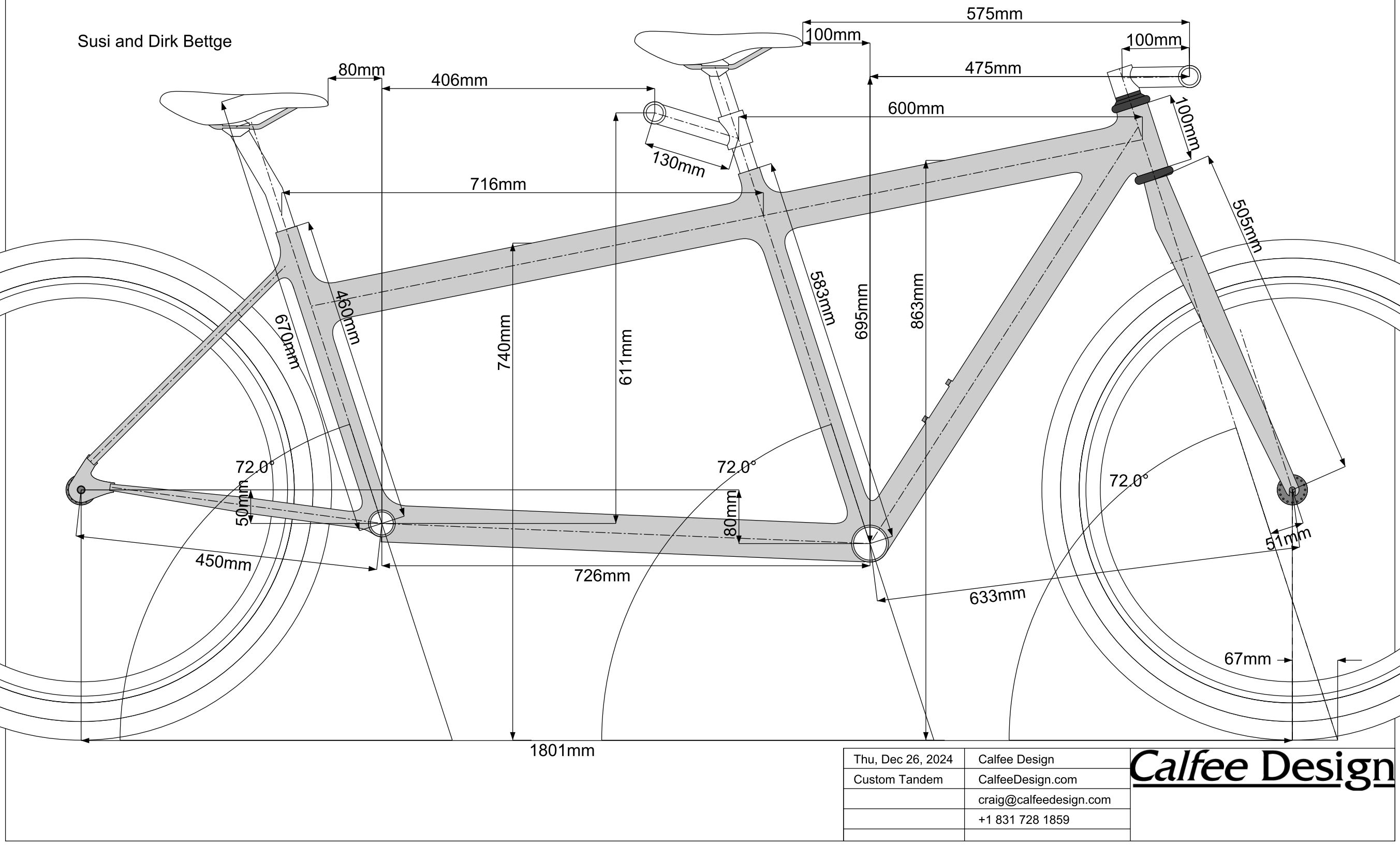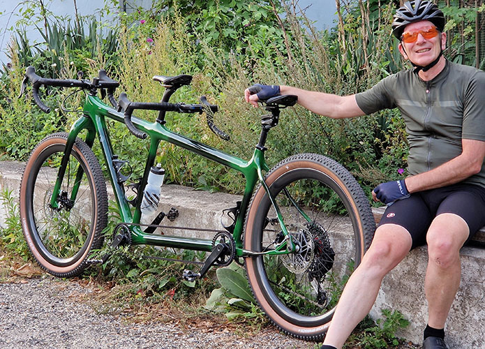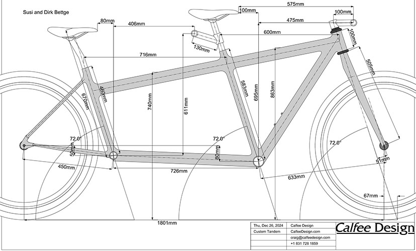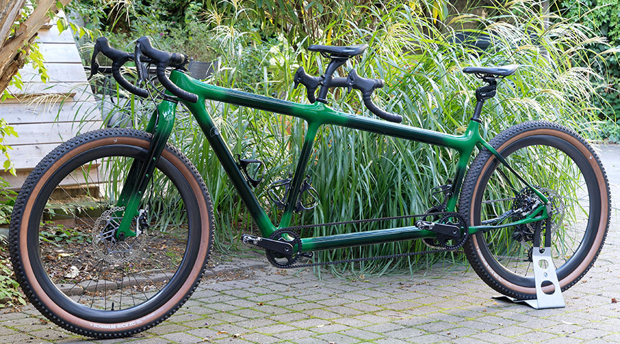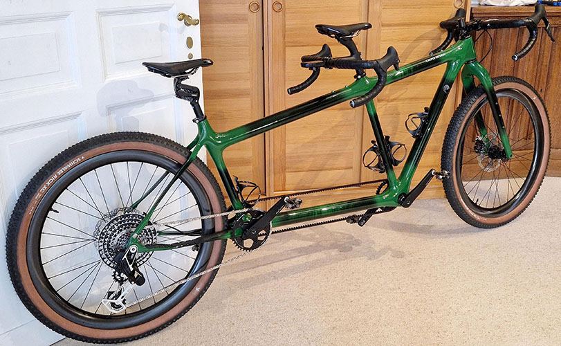 Es entsteht wieder etwas neues – ein Gravel-Tandem, wiederum realisiert von Calfee Design. Nach unseren guten Erfahrungen mit dem Renntandem in 2017 haben wir uns im Dezember 2024 zum zweiten Mal an die Kalifornier gewandt. Unser Wunsch war ein Graveltandem, also mit Geometrie für Rennlenker, das aber für MTB-Reifen bis 65 mm Breite ausgelegt ist, um nicht im Brandenburger Sand zu versinken. Man könnte das Wide Gravel nennen oder auch Dropbar-MTB, aber es soll von der Geometrie her kein Kompromiss sein. Und bei alldem bitte aus ästhetischen Gründen falls möglich und sinnvoll ein durchgehendes Oberrohr. Es sollte mit einer Starrgabel und einer Federgabel geliefert werden, die austauschbar sein sollen. Der Rahmen sollte wiederum ein erhöhtes hinteres Tretlager haben. Die Schaltung ist eine Kombination von aktuellen Sram AXS Rennrad-Hebeln und Sram Transmission MTB-Komponenten.