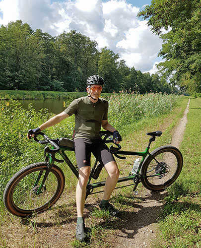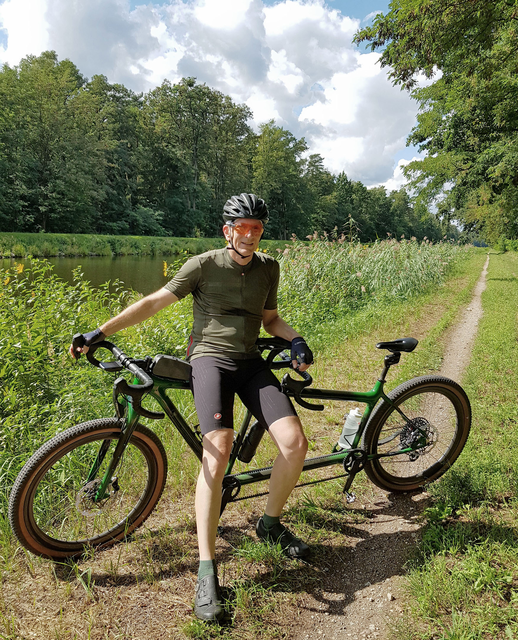 Das ganze zog sich dann ein wenig hin, aber das ist nicht überraschend bei einem doch recht kleinen Custom-Hersteller. Im Juli war das Rahmenset fertig und wurde vor Ort mit einem anderen Laufradsatz getestet. Auf dem Bild unten (Ende Juli 2025) fehlen noch Stoker-Dummygriffe und Feder-Sattelstütze hinten. Nun konnte es bald in den Versand gehen. Pedale würden wir selbst besorgen. Ein gefederter Redshift-Vorbau vorn würde später nach den ersten Probefahrten passgenau in der richtigen Länge beschafft.